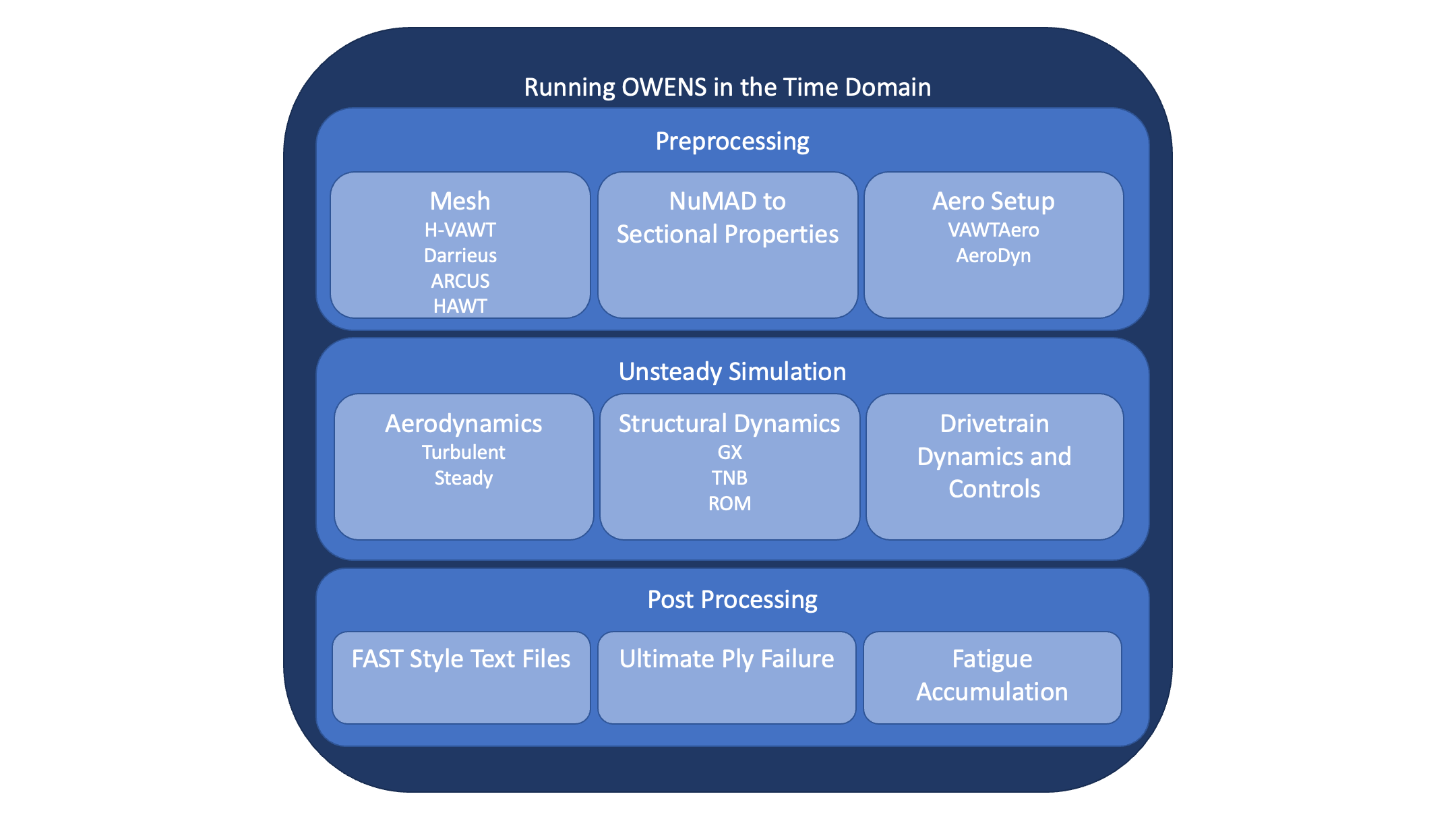 OWENS is comprised of many building blocks. These series of examples progressively shows the internals of several of the key building blocks a new user might employ for their projects. Fundamentally, OWENS has been built to be as generalizable as possible. The lowest level of building blocks enable this, however, there are many common use cases for which helper functions have been developed, such as for meshing certain standard architectures and calculating and applying sectional properties to these architectures. The figure below summarizes this at a high level.