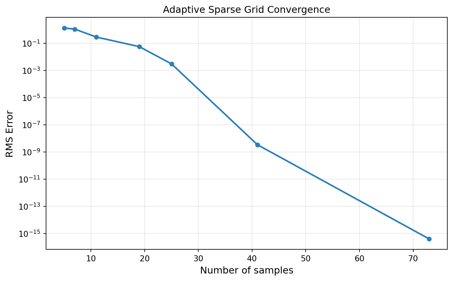 step_samples()/step_values()) allows fine-grained control; usefitter.current_error()to stop when the estimated error drops below a tolerance. - For UQ with sparse grids (moments, Sobol indices, marginal densities), see UQ with Sparse Grids.