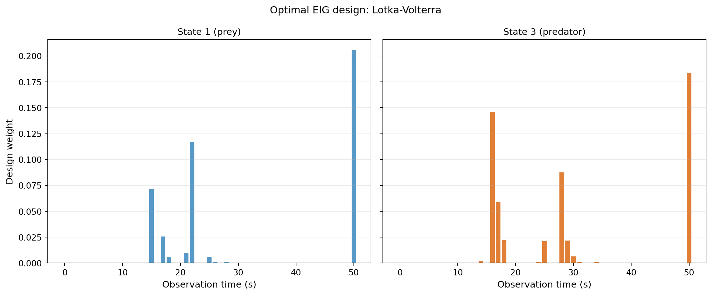 The informativeness of a measurement depends on when it is taken. Early measurements, while the populations are still near their initial conditions, reveal little about the interaction rates \(\theta_2, \theta_3\) — those only become visible once predator-prey cycling has developed. Observations near a population peak or trough carry the most information about the amplitude parameters. OED finds the combination of times that, in expectation across all possible parameter realizations, is most informative.