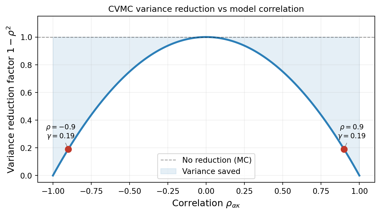 where \(\rho_{\alpha\kappa} = \mathrm{Corr}(f_\alpha, f_\kappa)\) is the correlation between the two model outputs. The factor \((1 - \rho^2_{\alpha\kappa})\) is always between 0 and 1, so CVMC always reduces (or at worst equals) the MC variance.