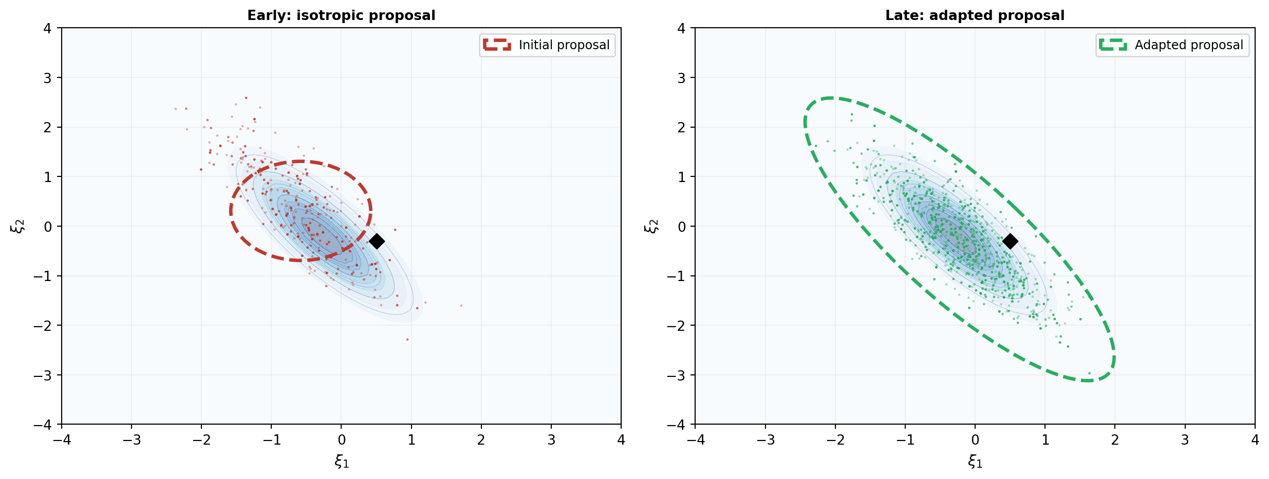 #| fig-cap: "Adaptive Metropolis learns the posterior shape. Left: initial isotropic proposal (circle) — the chain makes many rejected moves perpendicular to the posterior ridge. Right: after adaptation, the proposal aligns with the posterior's correlation structure (tilted ellipse) — the chain moves efficiently along the ridge."