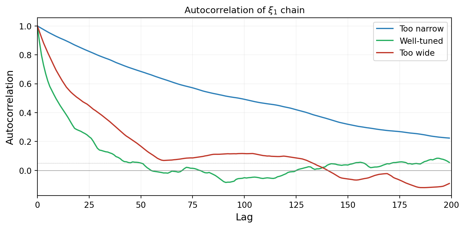 - Diagnose the effect of proposal width on chain mixing: too narrow, too wide, and well-tuned