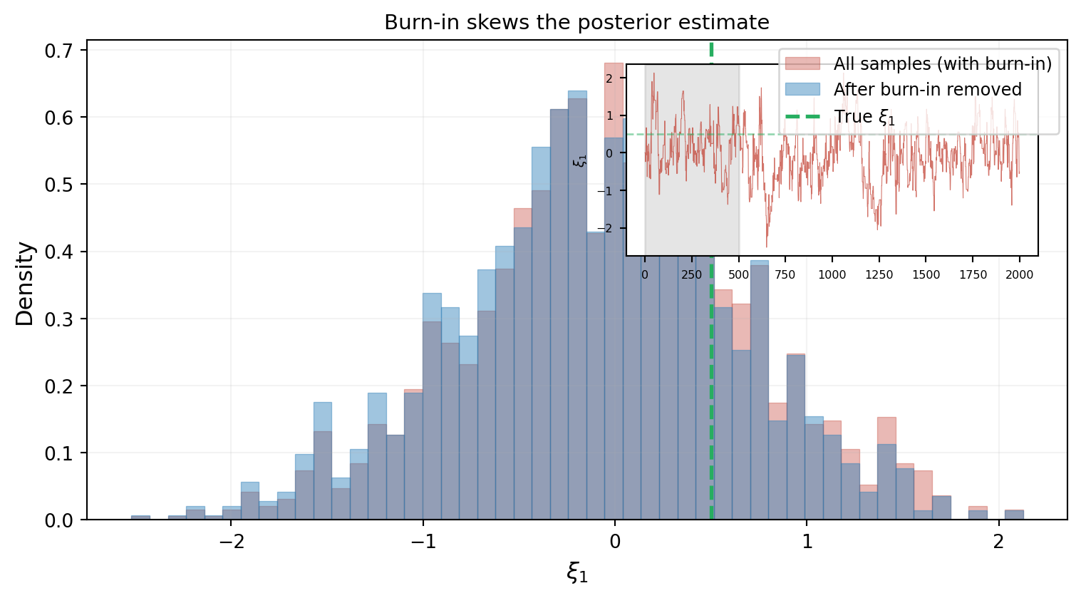 4. **Remove burn-in**: discard the initial transient. When in doubt, be generous --- discarding too many samples is safer than including biased ones.