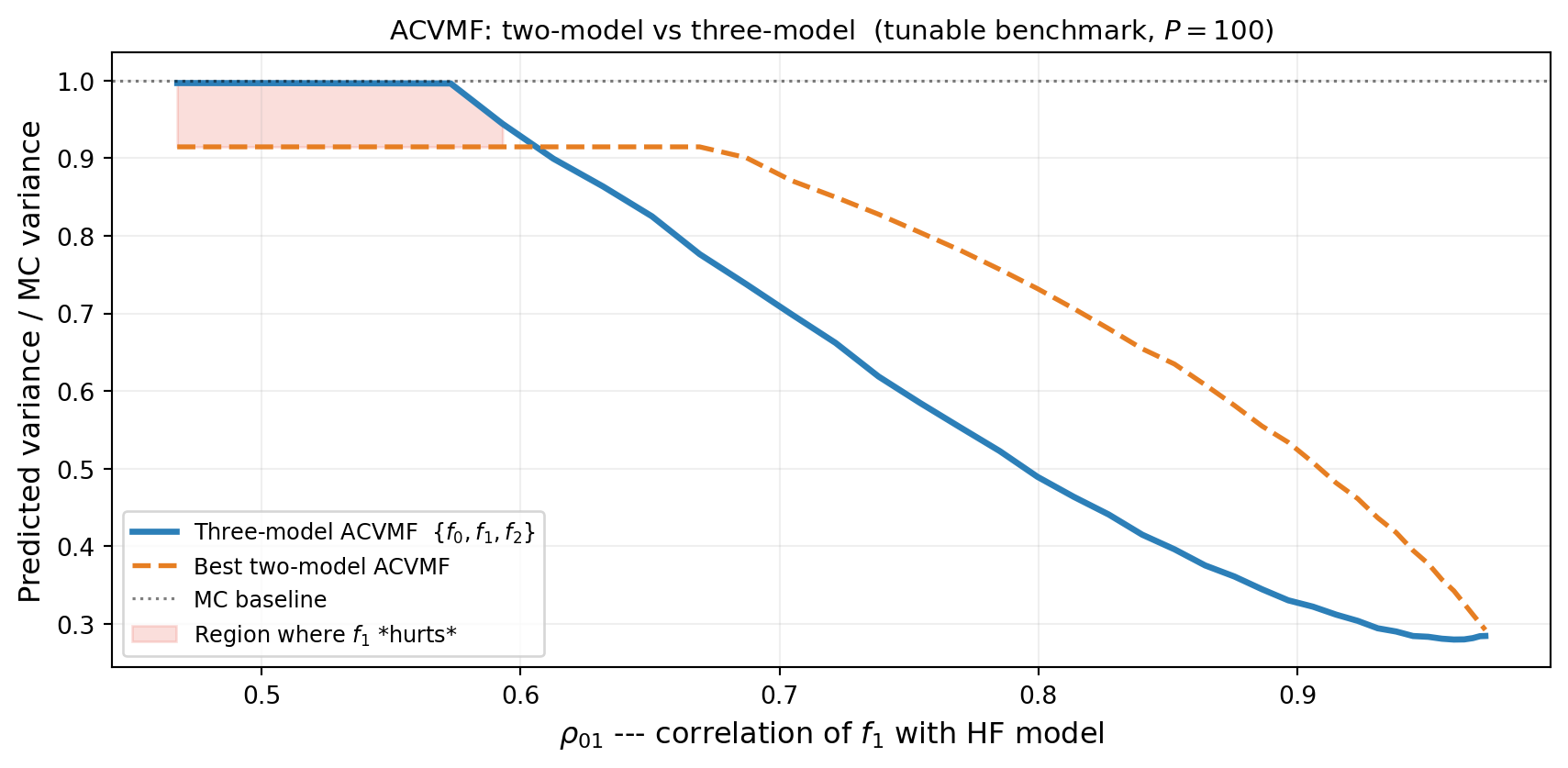 Figure 3 shows the ACVMF variance ratio (relative to MC) for the best one-LF and two-LF subsets across a range of \(\rho_{01}\) values. The winner depends on the correlation structure: at low \(\rho_{01}\), using only \(f_2\) is best; at high \(\rho_{01}\), the full three-model ensemble wins.