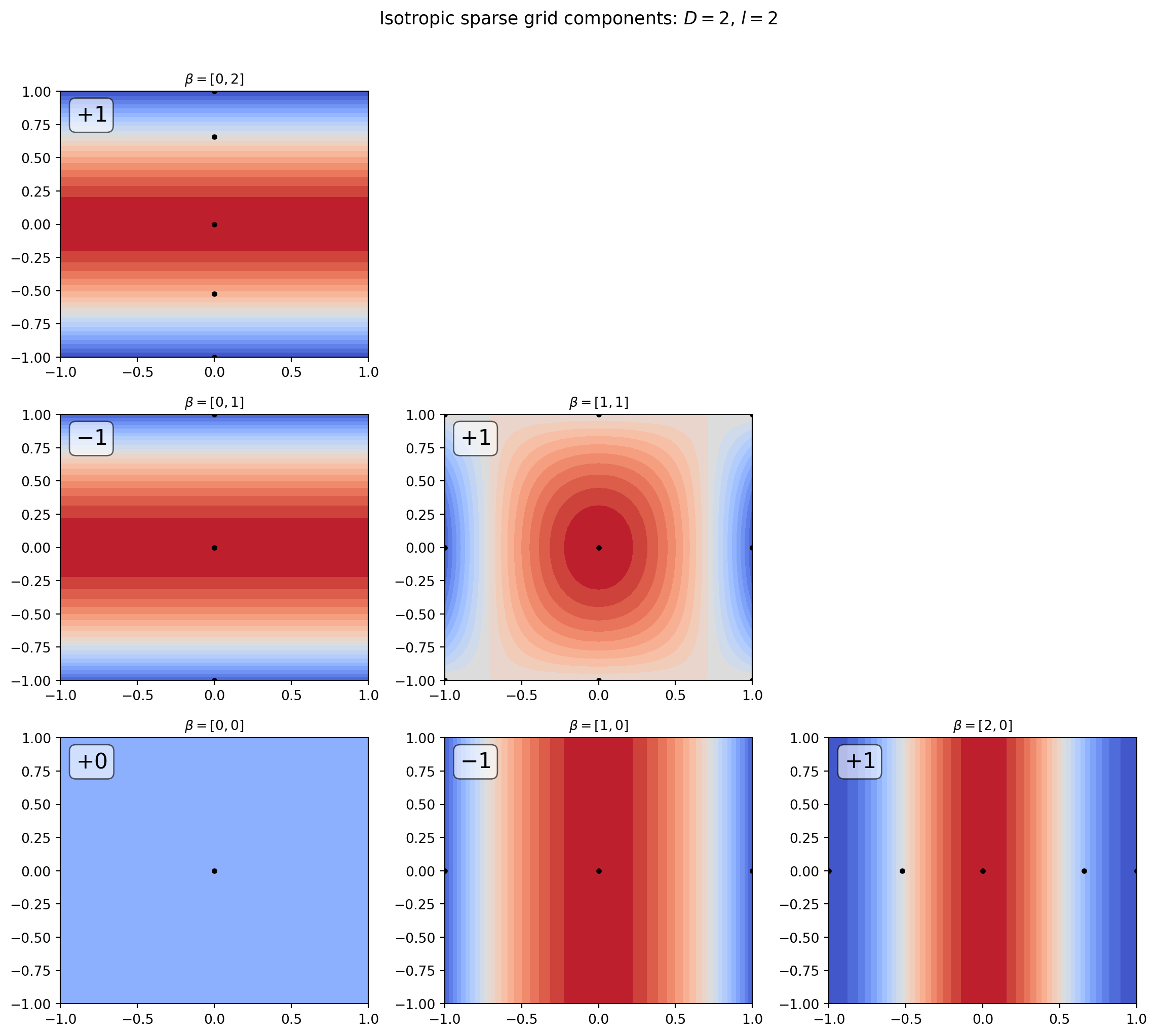 The figure below shows the tensor product subspaces that enter the \(l = 2\) isotropic sparse grid in 2D. Each sub-grid is drawn as a contour plot of the corresponding interpolant, with its Smolyak coefficient labelled. Sub-grids with coefficient \(+1\) are added; those with coefficient \(-1\) are subtracted.