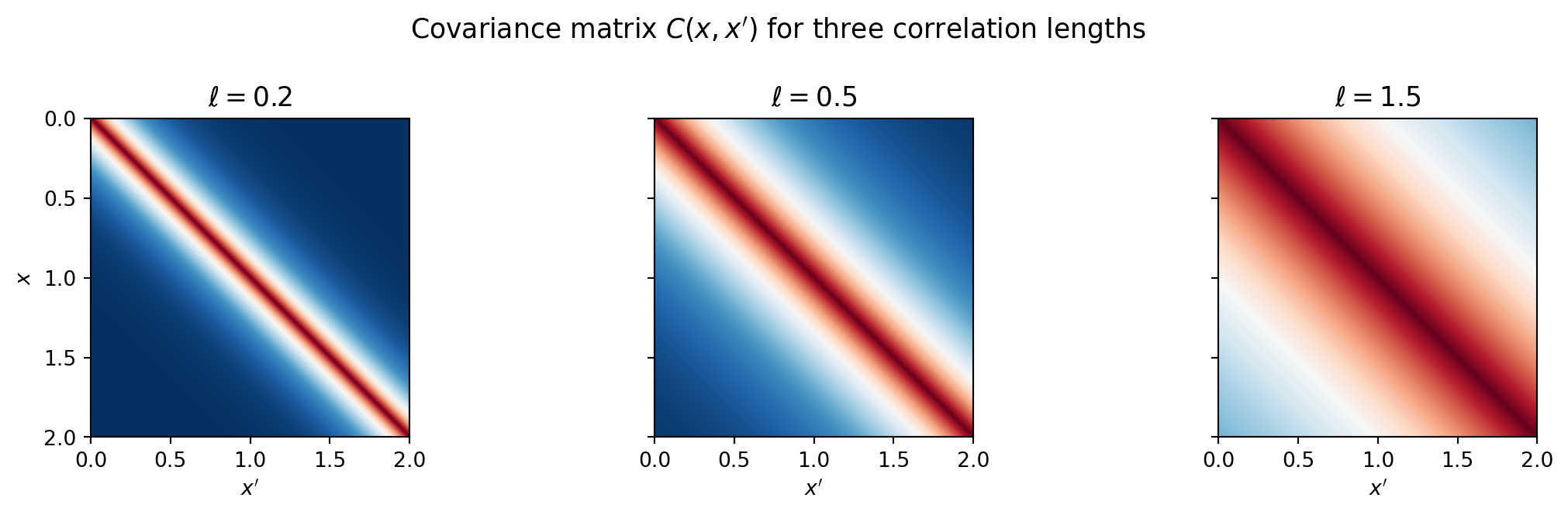 The covariance \(C(x, x') = \sigma^2 k(x, x')\) determines how similar the field is at nearby points. The correlation length \(\ell\) controls the spatial scale.