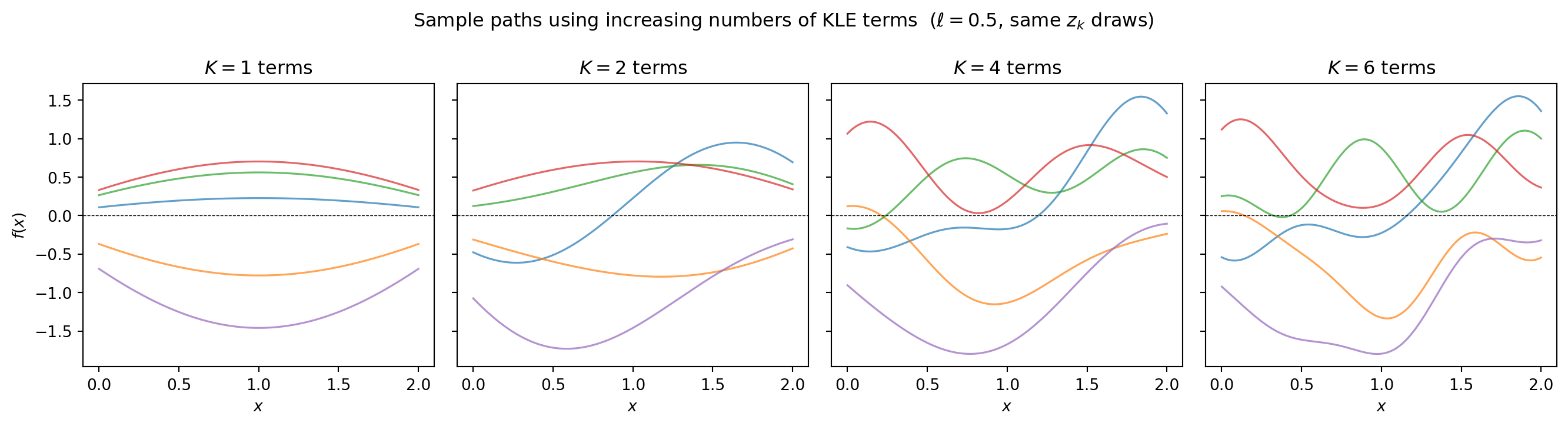 More terms produce rougher, more detailed realizations. With \(K = 6\) terms we have captured essentially all the variance for \(\ell = 0.5\).