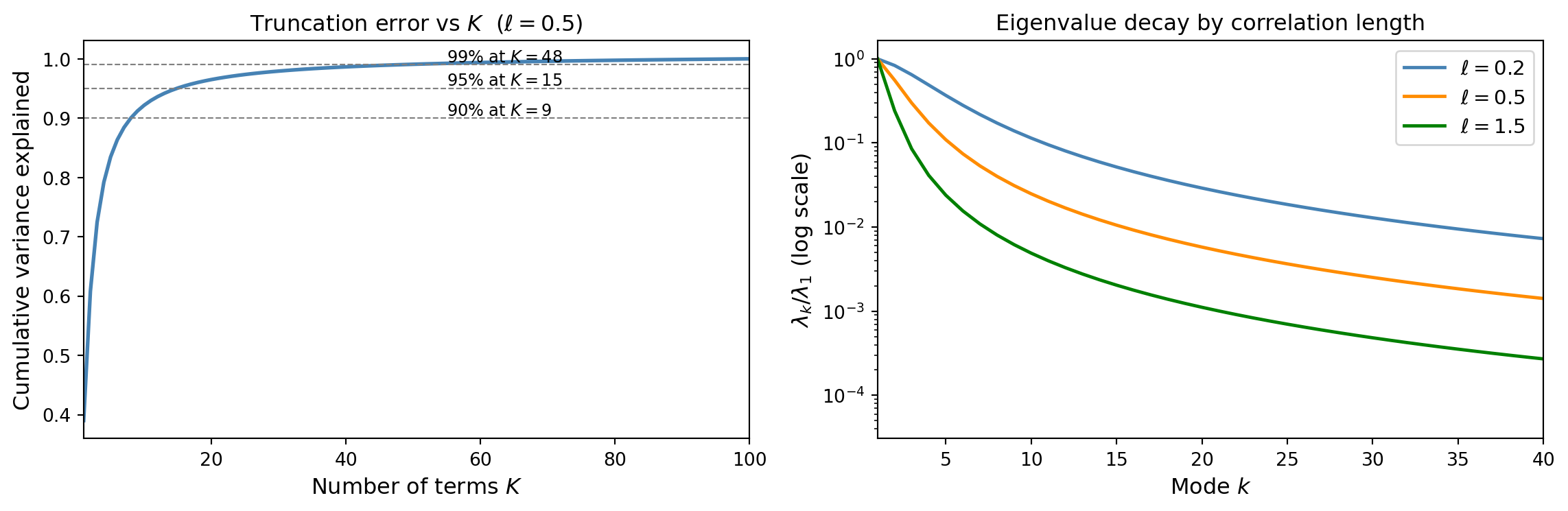 Key insight: larger \(\ell\) produces faster eigenvalue decay and fewer terms are needed. Smooth fields are cheap to represent; rough fields require many modes.