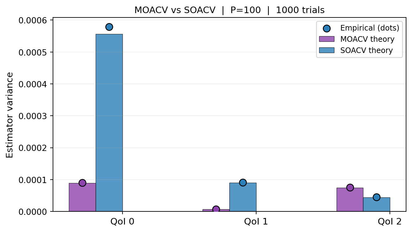 Figure 1: Theoretical (bars) vs empirical (dots) variance for each QoI under MOACV and SOACV, from 1000 independent trials. MOACV (purple) achieves lower variance for every QoI than SOACV (blue).