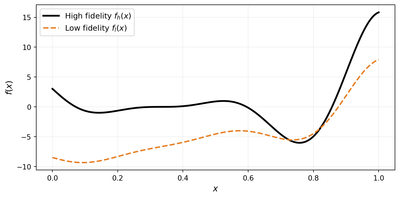 Many simulators exist at multiple fidelity levels: a cheap approximation captures the broad trend while an expensive high-fidelity model adds fine-scale detail. The outputs are highly correlated — the cheap model is inaccurate in absolute terms but tracks the expensive model closely enough to carry information.