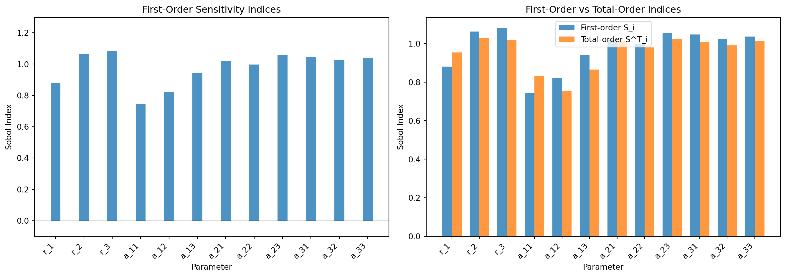 #| fig-cap: "Sobol index estimates for the 3-species Lotka--Volterra model (QoI: species 1 final population). Left: first-order indices $S_i$ showing direct parameter contributions. Right: comparison of first-order and total-order indices---large gaps (e.g. interaction coefficients) indicate parameter interactions."