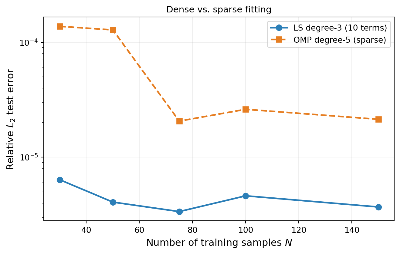 - When most coefficients are near zero, sparse methods achieve better accuracy with fewer samples than dense least-squares at the same degree