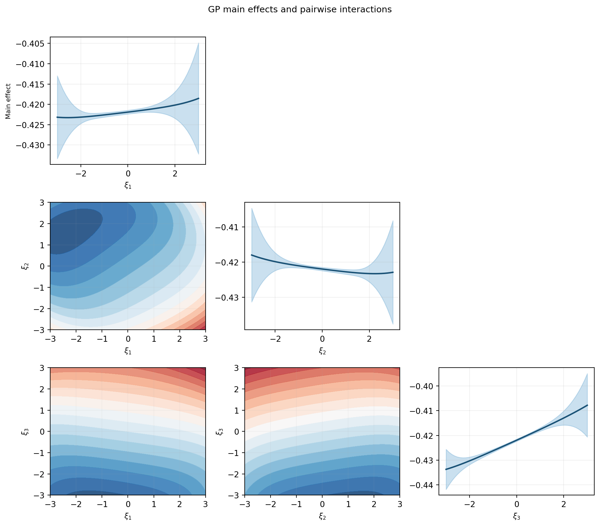 Figure 2 shows the main effects (diagonal) and pairwise interactions (off-diagonal) of the GP surrogate, analogous to the FT tutorial.