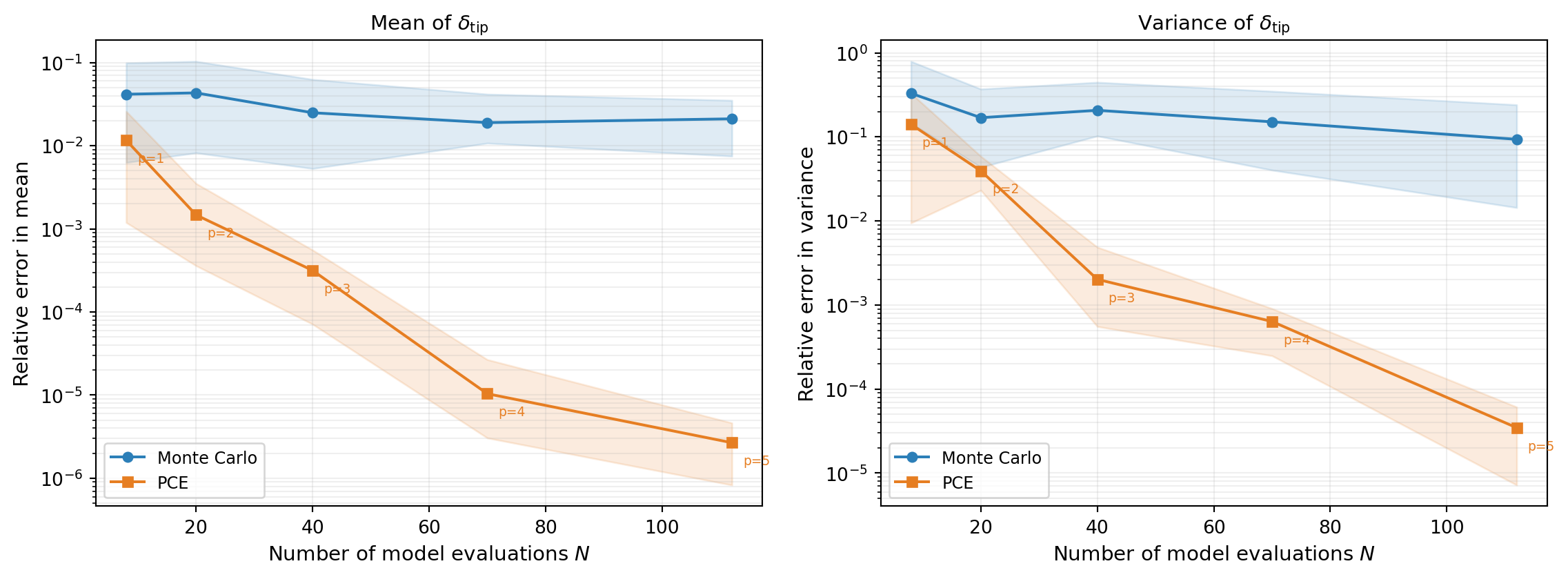 For Monte Carlo, we use all \(N\) samples directly. For PCE, we increase the polynomial degree with the budget, keeping an oversampling ratio of 2 (twice as many samples as basis terms). This lets the PCE error decay as the budget grows, since higher-degree expansions capture more of the model’s structure.