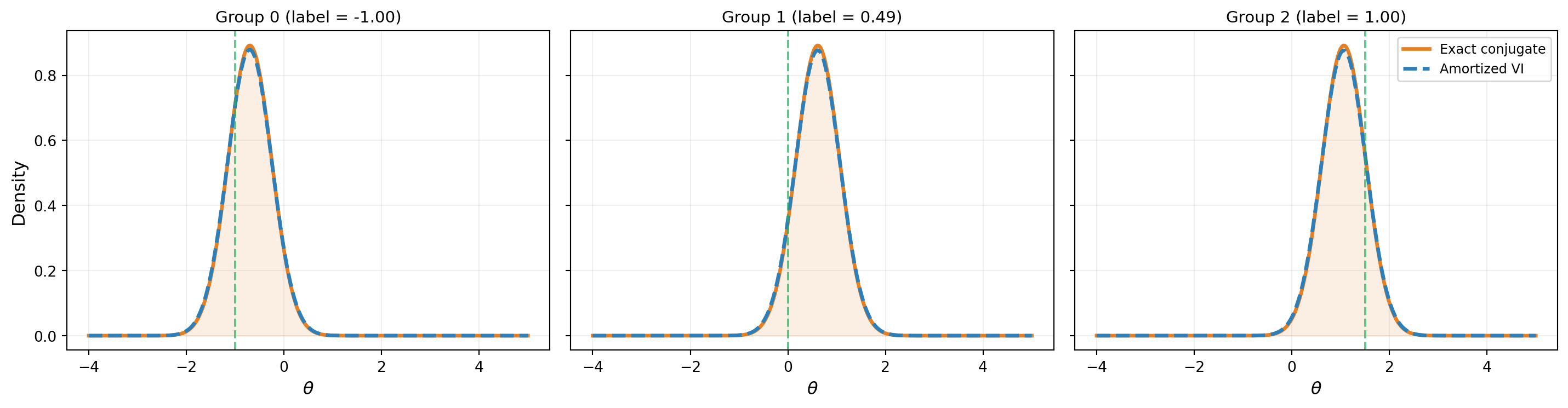 Figure 2 shows the amortized VI posteriors at each training group compared to the exact conjugate posteriors.